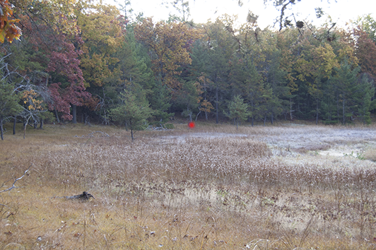 Comments about Hole #10 – This hole is long but a good hard drive can come darn close to the pin. The trees on the left side of the pin come into play for those with a fade. Depending on the amount of rain in the year the wetlands can have as much as a foot of water in them (or be bone dry) which provides a brisk experience if your disc heads into the water.